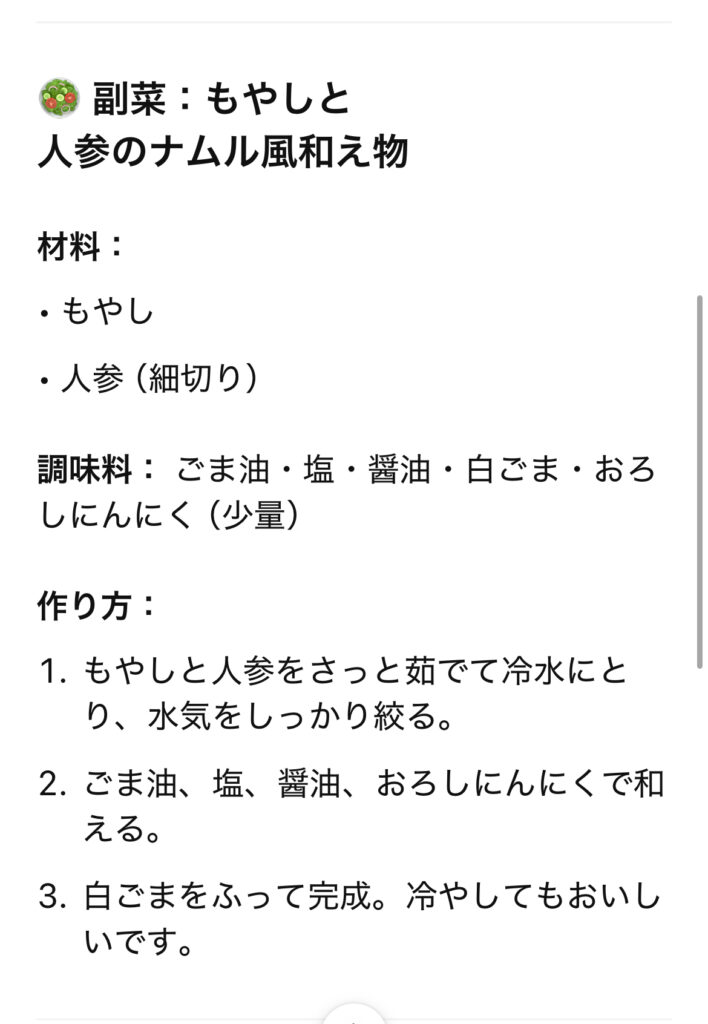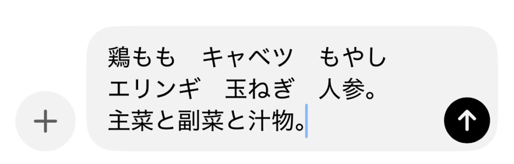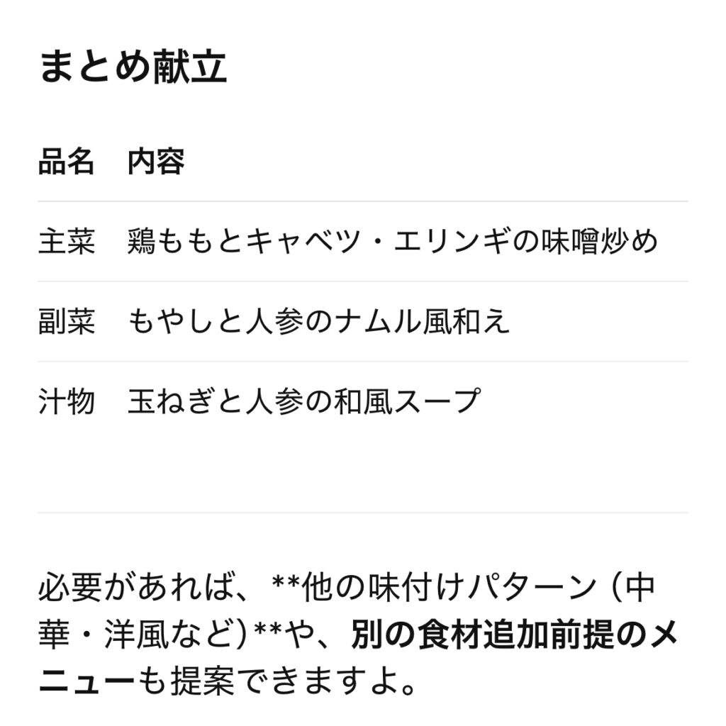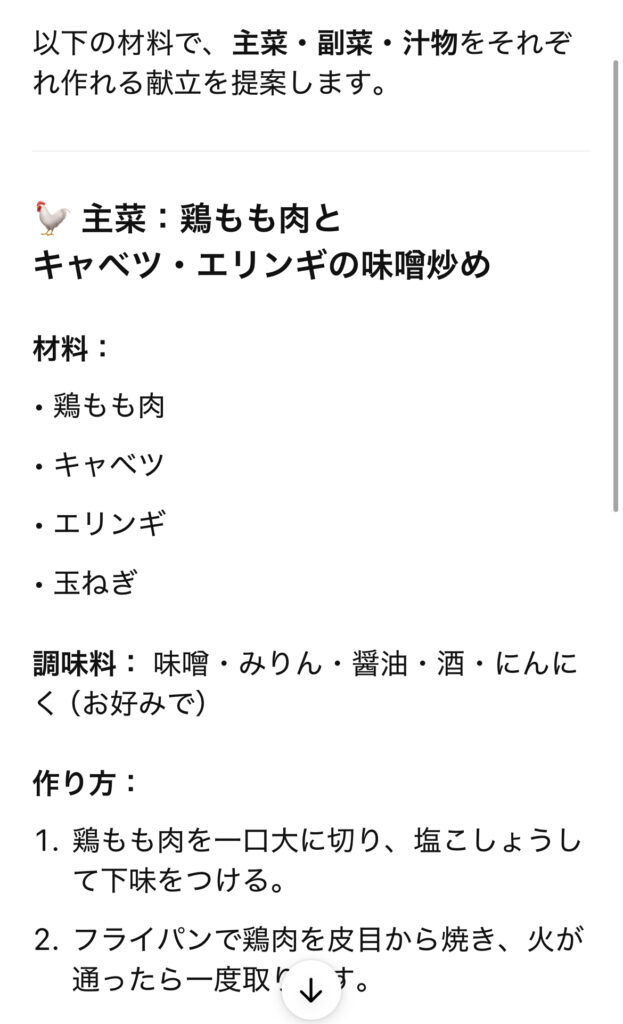 「鶏もも キャベツ 晩ごはん」くらいの簡単な入力でもしっかり答えてくれます。