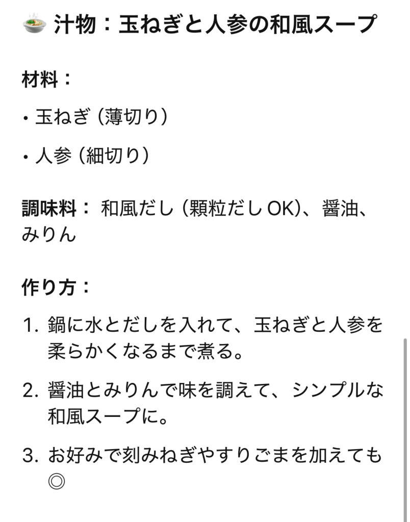 主菜・副菜・汁物まで考えてくれて、今日の晩ごはんがすぐに決まりました!